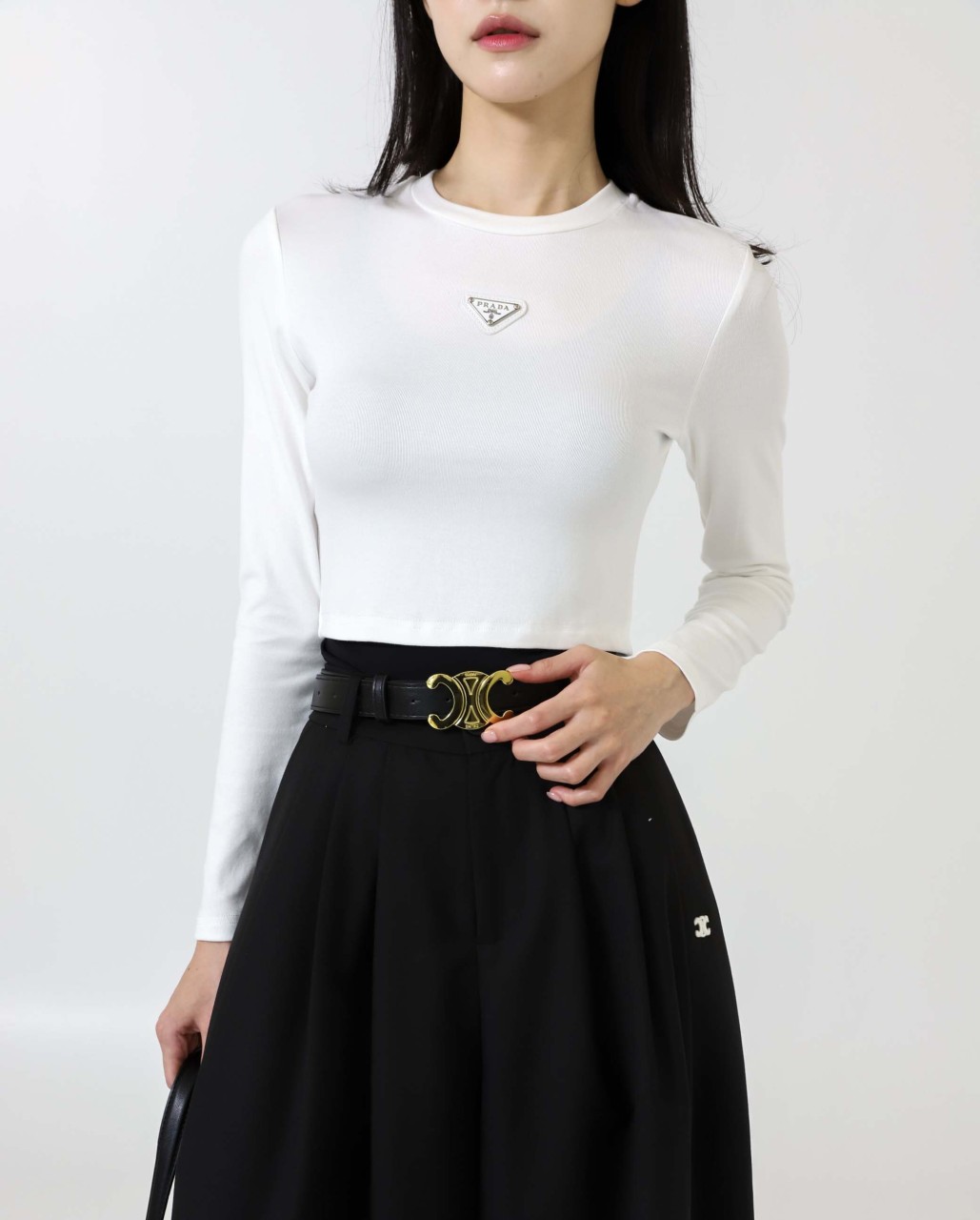 프라다 [ P*ADA ] 수입 트라이앵글 넥플레이트 크롭 티셔츠 -화이트-