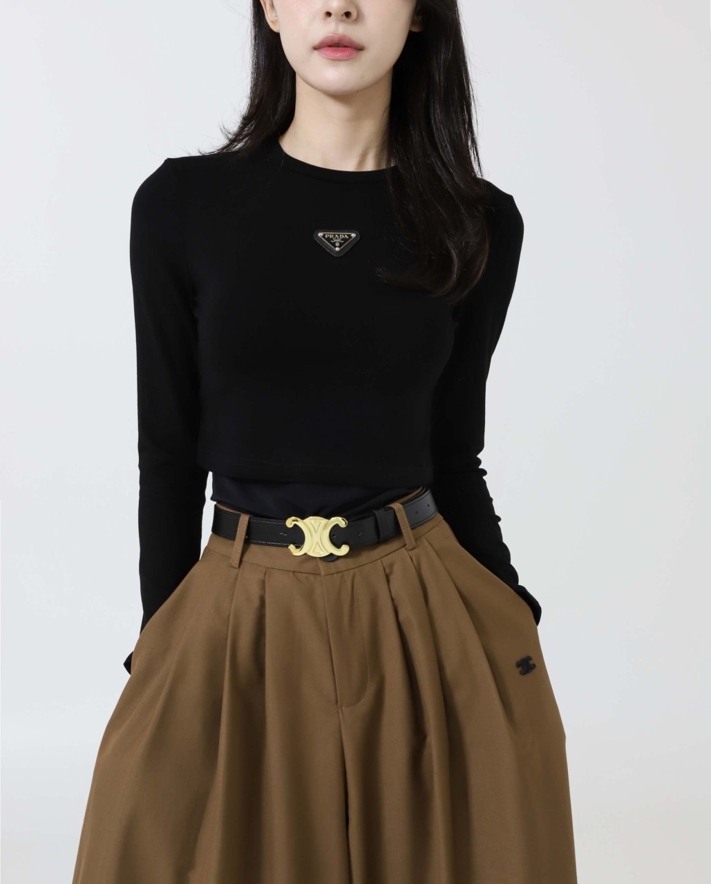 프라다 [ P*ADA ] 수입 트라이앵글 넥플레이트 크롭 티셔츠 -블랙-