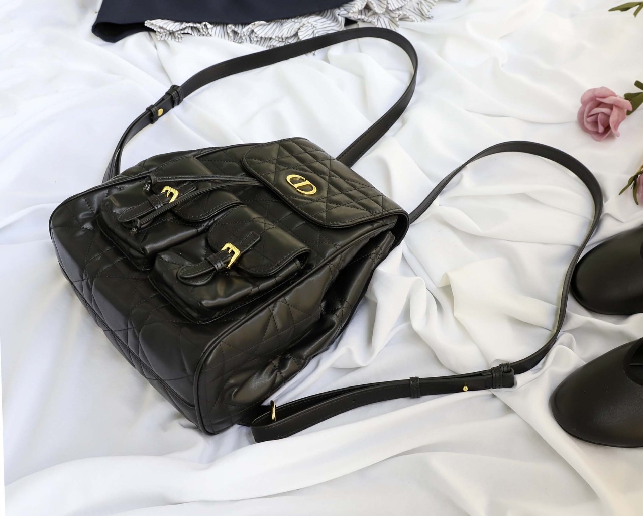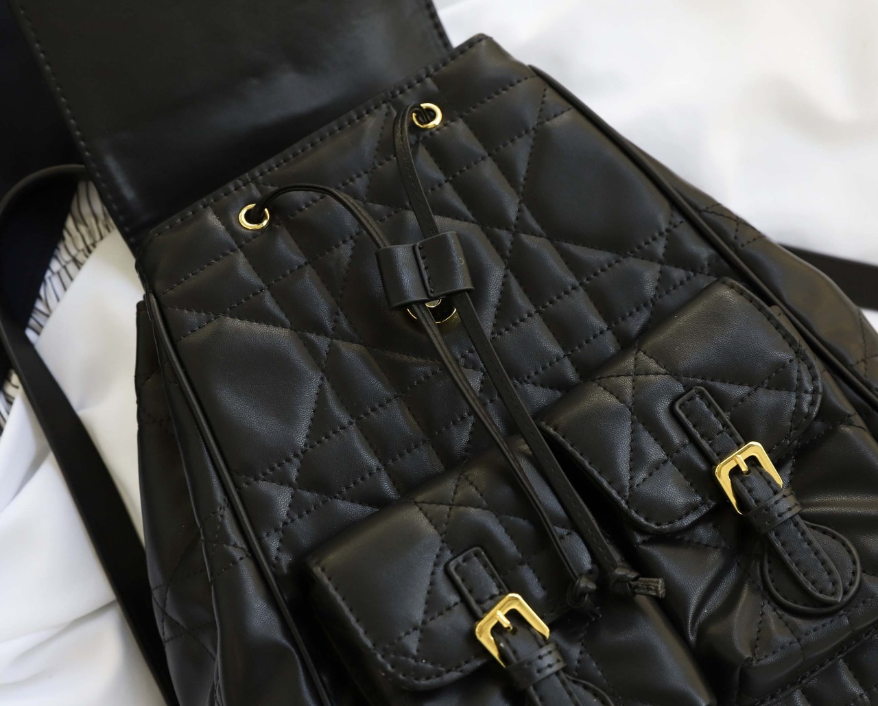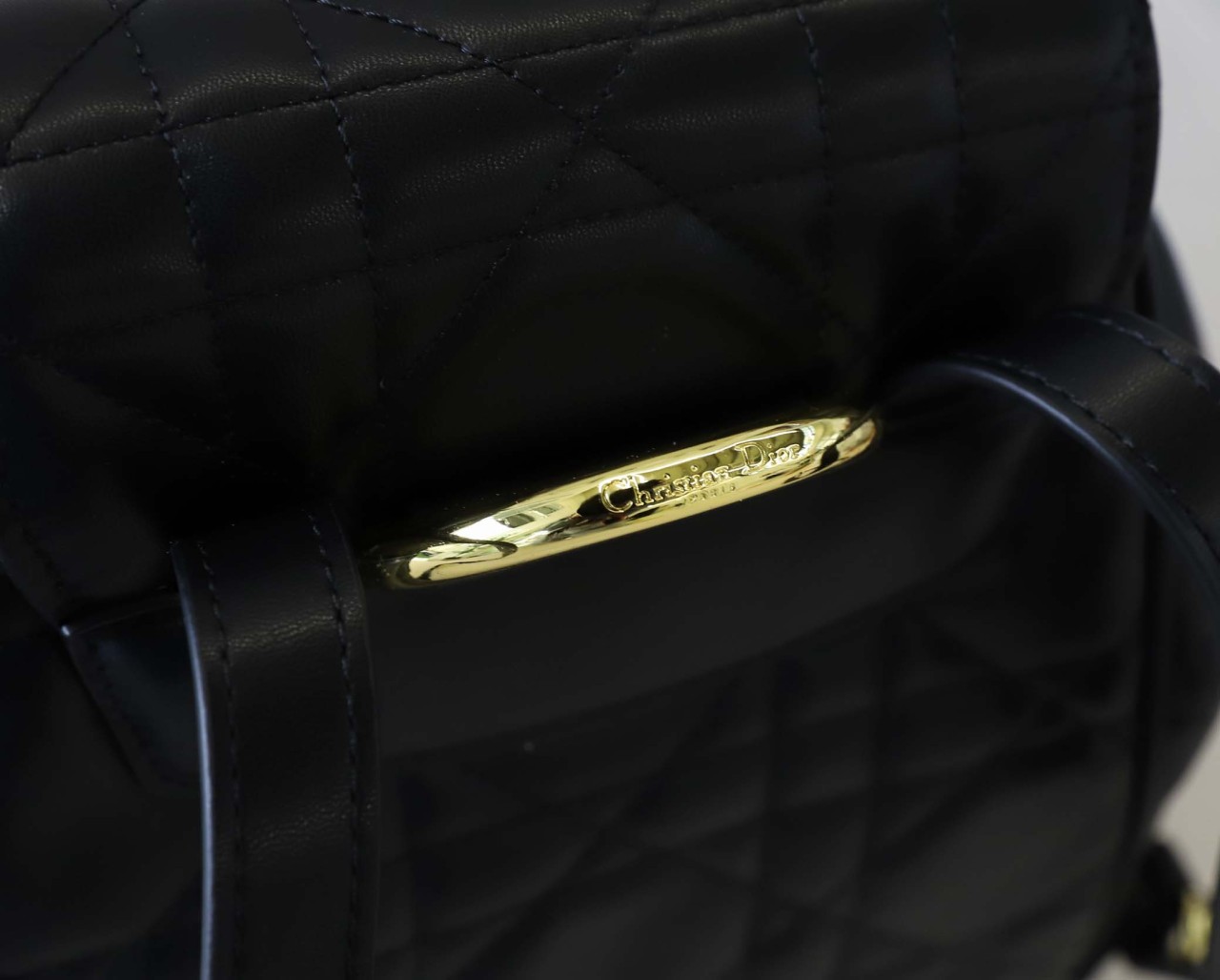 매크로까나쥬 스티칭을 더한 블랙 양가죽 소재로 제작되었으며, 앤틱 골드 피니시 메탈 CD 시그니처 디테일의 플랩을 열면 나타나는 넉넉한 드로우스트링 메인 수납공간과 작은 데일리 소지품을 모두 담을 수 있는 스몰 플랩 포켓 2개가 특징.