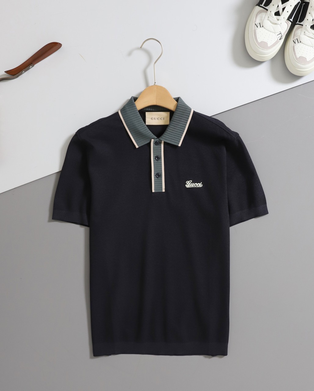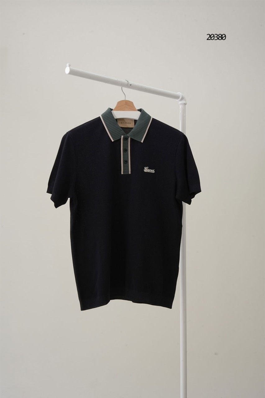 [GUCCI] 구찌 로고 자수 배색 카라 반팔 티셔츠