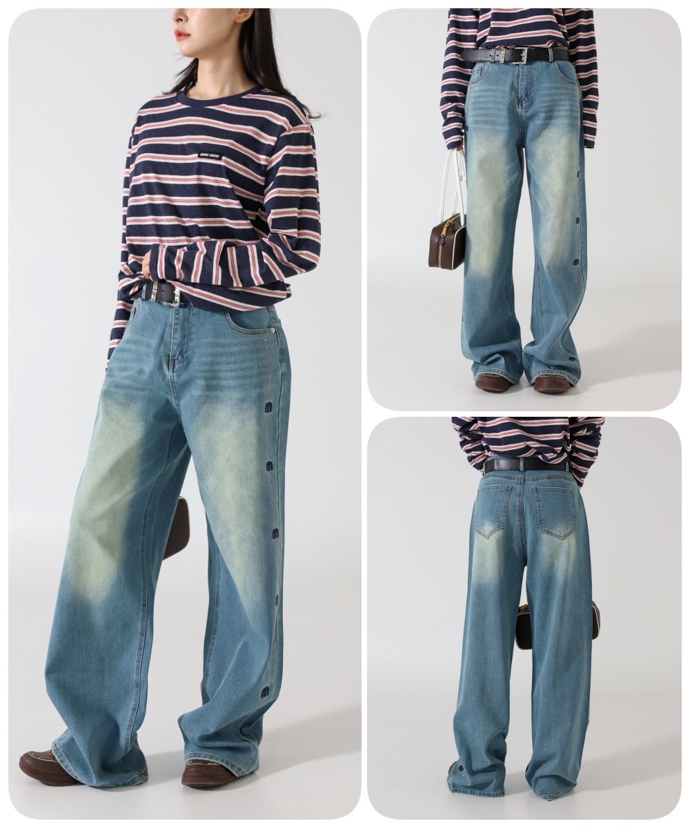 미우미우 [ Miu ] 수입 여성 사이드 다이애그널 로고 리벳 와이드 진